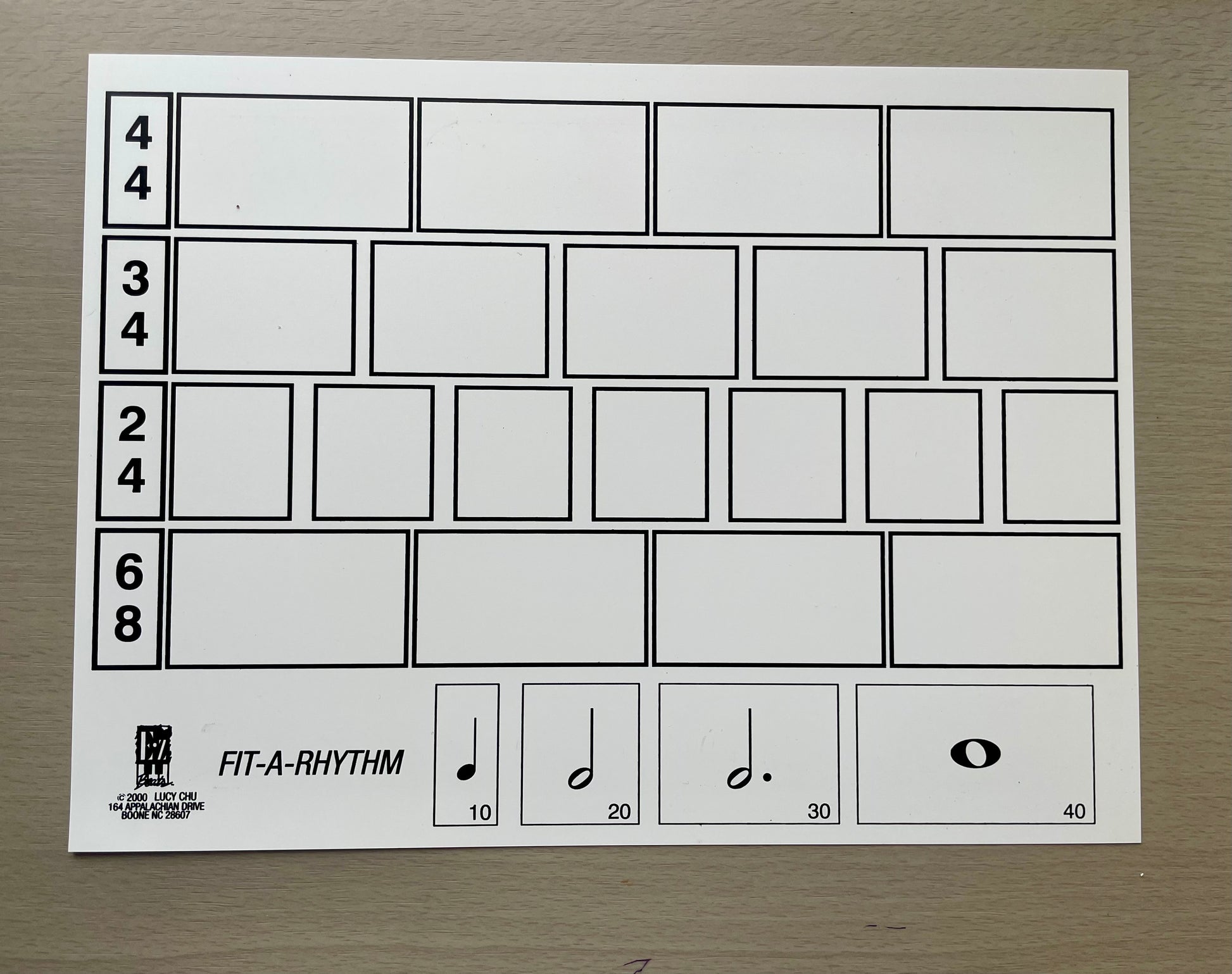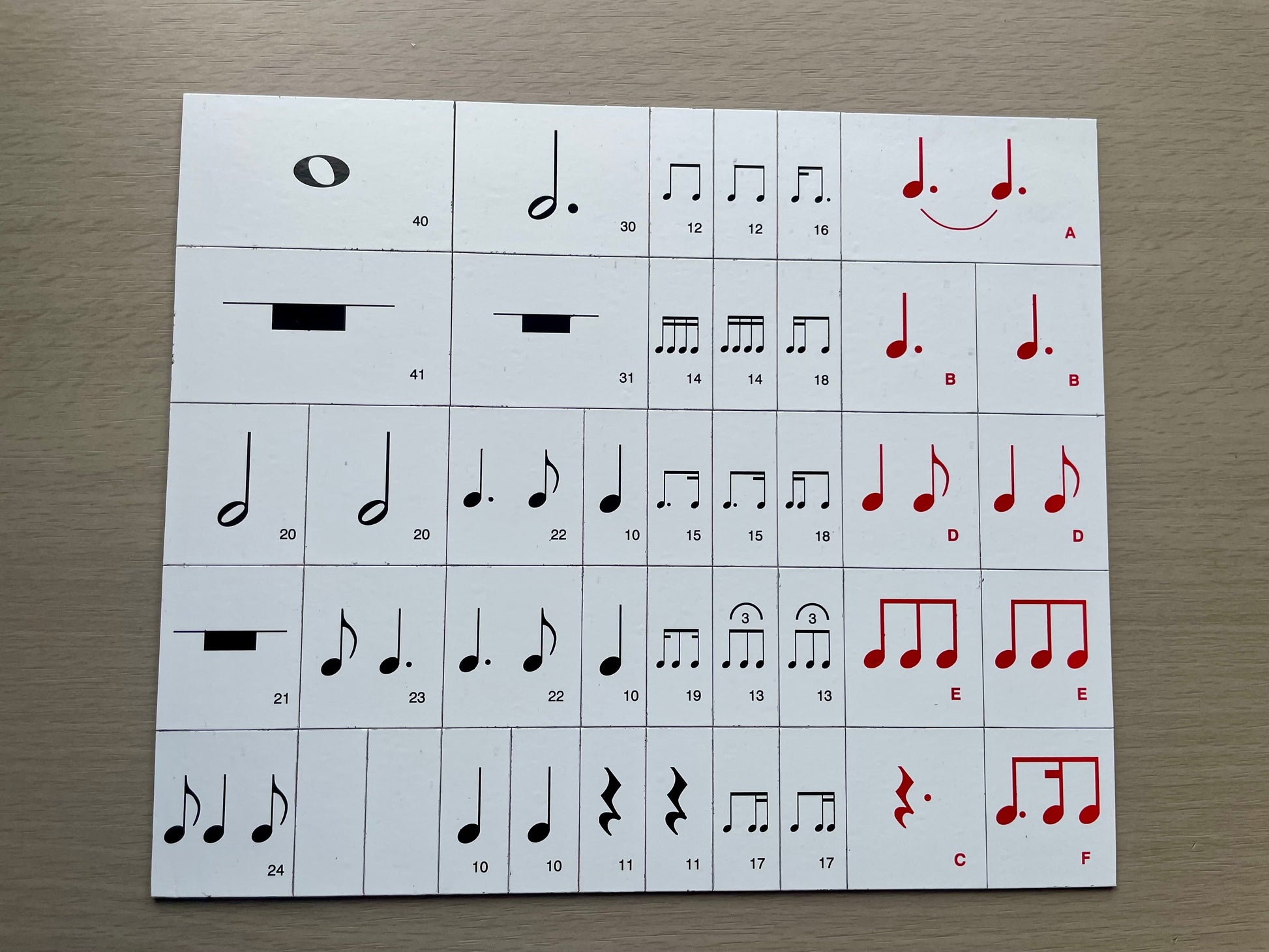 - 40 magnetic tiles printed with different rhythms align to blank measures