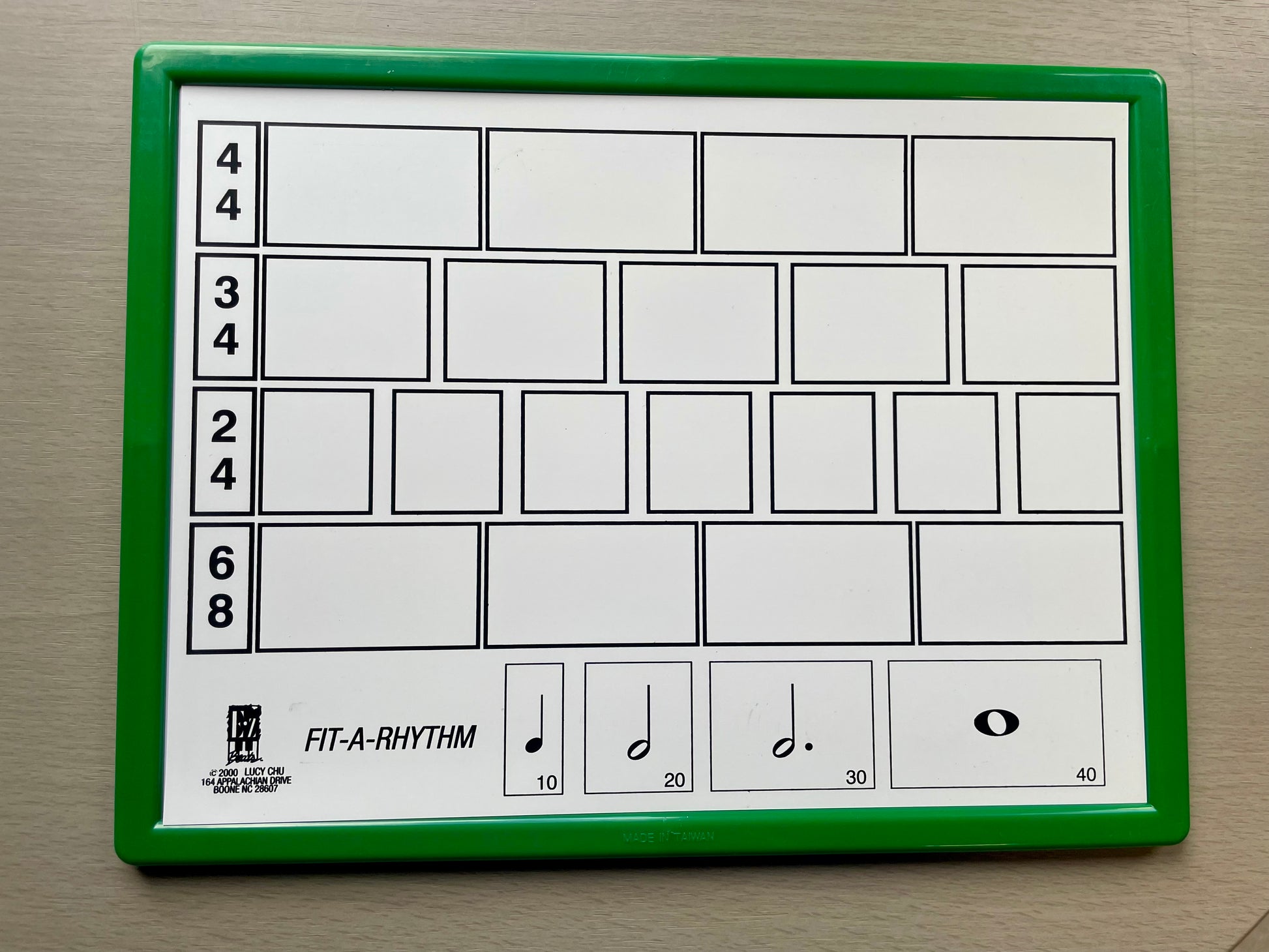 The Fit-a-Rhythm insert fits neatly into the frame. The tile sizes are proportionate to the rhythmic value.