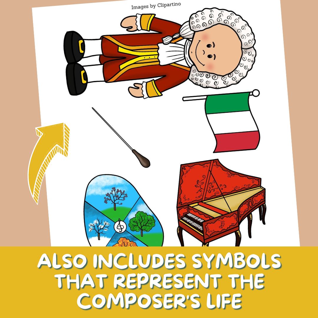 In addition, there are clip art symbols that represent important parts of Vivaldi's life.